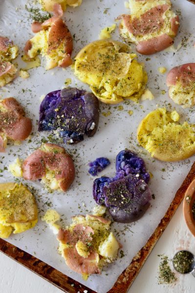 Drain the potatoes and pat dry with a towel. When they’re cool enough to handle, transfer them to the parchment paper-lined baking sheet, and gently smash with a fork, until they’re about ¼-½ inch thick. Drizzle the melted oil over all the potatoes, then sprinkle with 2 Tbsp ranch seasoning. You will have some leftover.